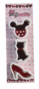 Set compuesto por 3 moldes de diferentes divertidos diseños para niña o varón. Muy buen corte. Fácil de limpiar. Ideal para realizar galletitas junto a los chicos de la familia y dejar volar la imaginación a la hora de decorarlas.