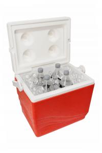 Aislación de espuma de poliuretano expandido ecológico. Tapa doble función, al dar vuelta se puede utilizar de mesa con posavasos. La tapa se traba con el asa para un cómodo transporte . Uso familiar o industrial. Admite 4 botellas de 1,5 lt. paradas.
